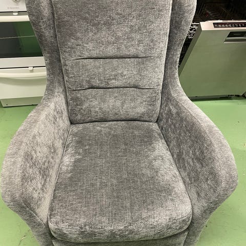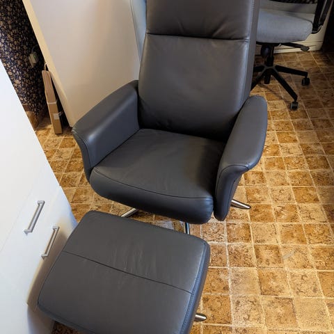 Fåtölj med tipp att luta sig bakåt. Mörkgrå bra skick lite skav på bakbenet nederst
