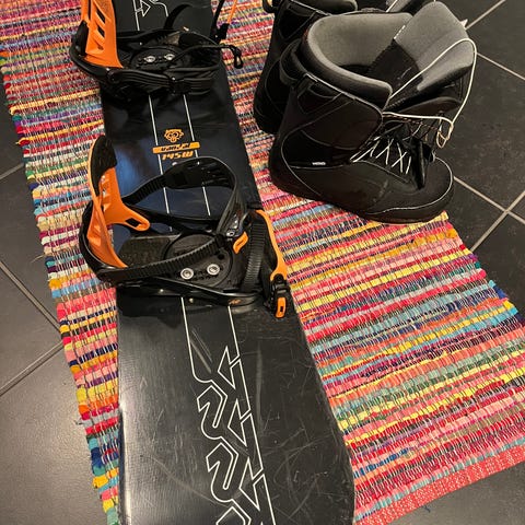 Komplett snowboardutrustning bestående av bräda, bindningar och boots. Snowboardväska från Burton