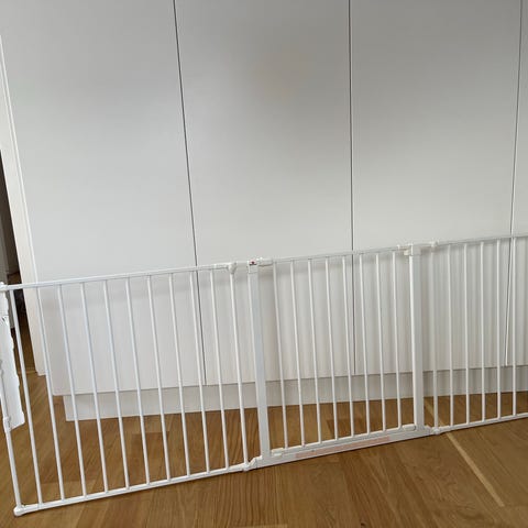 Fint och hel barngrind. Finns att hämta i centrala Uppsala. Ca 70+ cm + 1 extension. Hos oss satt den i en dörr som var 86 cm.