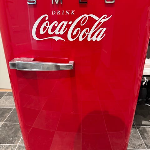 Röd kylskåp i kompakt storlek med 115 liters kapacitet.