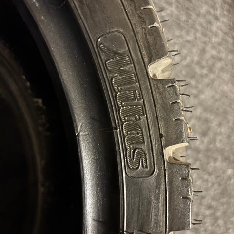 Däcken har bra mönsterdjup kvar och dubbarna sitter fortfarande bra. Har fungerat utmärkt på snö och is. Normalt slitage för användning under två säsonger, inga kända skador eller punkteringar.