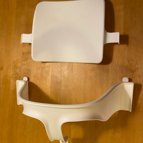 Stokke babydel i plast. Köpt sent 2024 och använt avbryt barn. Passar barn och är utformad för att ge stöd och säkerhet vid sittande.