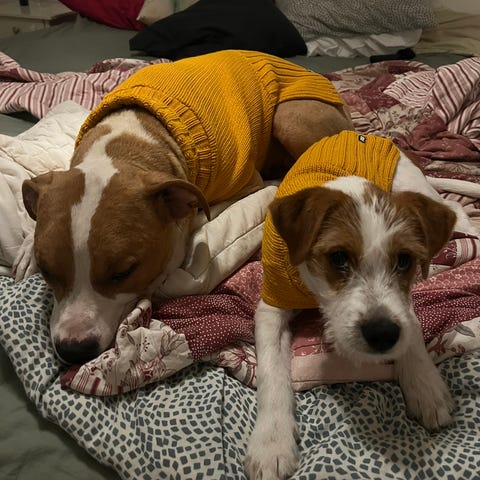 Jobbar gör vi hemma på gården så det är alltid någon hemma, vi har även en hund som är en labradorblandning.