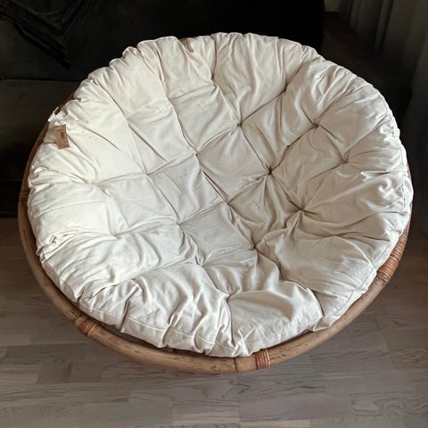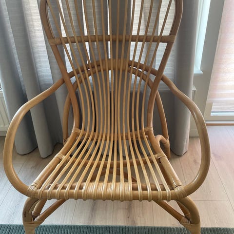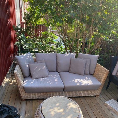 Superfin soffa i naturrotting. Går att ha både inne och ute. Ska man ha den ute behöver den stå under tak eller med skydd om den inte används då naturrotting är känsligt för vatten.
