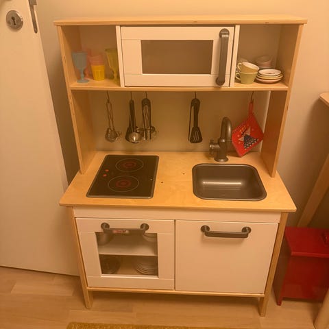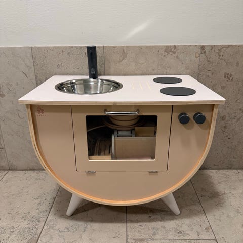 Cloudberry Barnkök i trä för barn. Köket har spis med vred, ugn och hyllor för förvaring. Designat för lek och inredning i barnrum.
