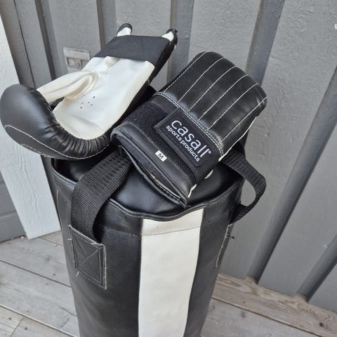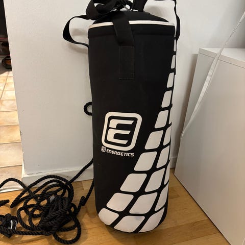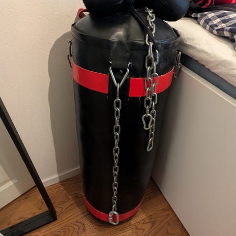 Boxningssäck cirka 155 cm hög. Kedja för att hänga upp den ingår men saknas krok att hänga upp den i.