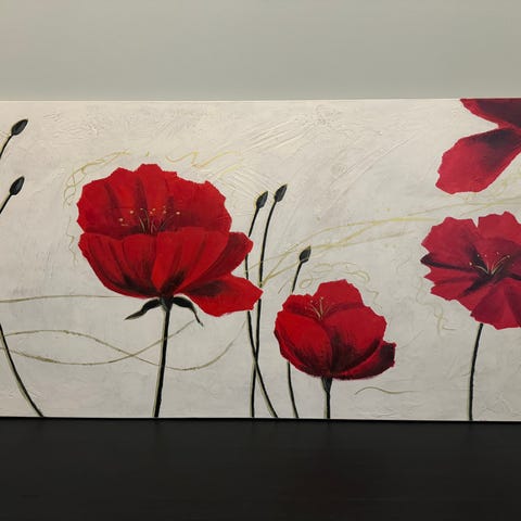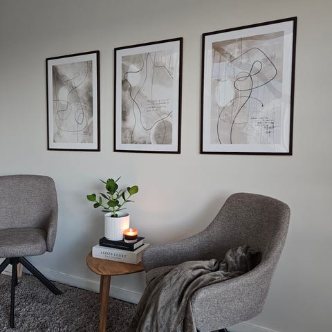 Set med tre konsttryck i posterformat, vardera inramade. Motiven är färgstarka och abstrakta med inslag av text. Passar för väggdekoration i olika rum.