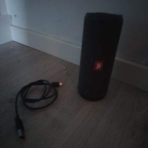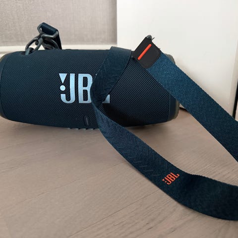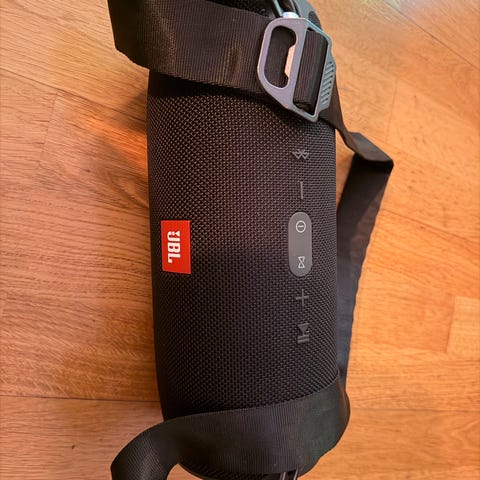 JBL bärbar högtalare i svart färg med axelrem för enkel transport. Enheten är designad för att leverera ljud i olika miljöer och är utrustad med funktion för portabelt ljud.