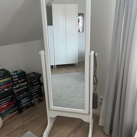 Säljer en stor och stilfull golvspegel med fina dekorativa detaljer. Passar perfekt i sovrum, hall eller walk-in-closet och ger rummet både ljus och rymd.