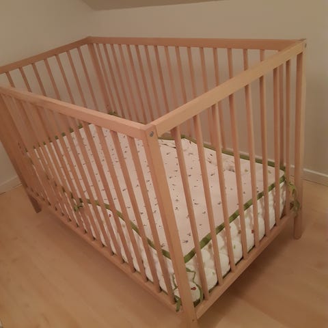 En väldigt fin och rejäl spjälsäng i trä som vi varit mycket nöjda med.