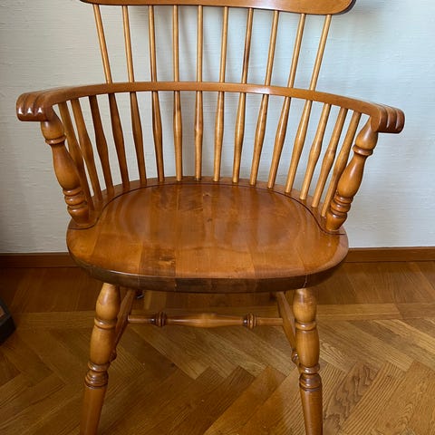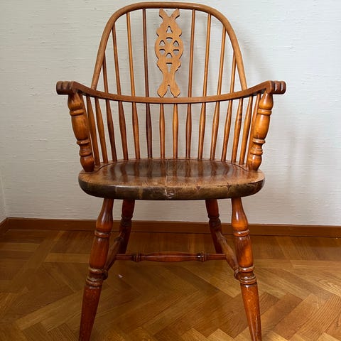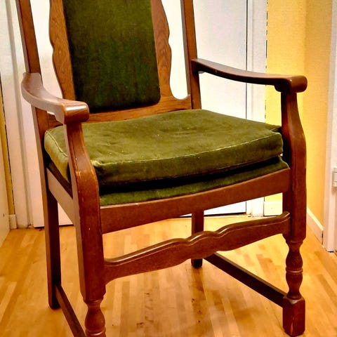 En gammal och sliten karmstol från 1800-talet. Pluggad. Passar som inredningsdetalj bättre än sittmöbel.