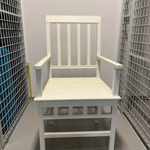 Stolen är sned och vind åt olika håll. Den skulle nog trivas i ett uterum eller i trädgården.