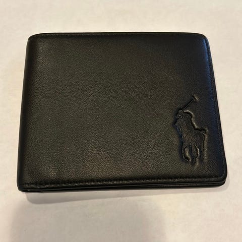 Ralph Lauren plånbok i läder för unisex. Plånboken har flera fack inklusive ett med dragkedja för förvaring av mynt och andra småsaker. Färgen är svart med guldfärgade detaljer. Nypris ca 1500-2000