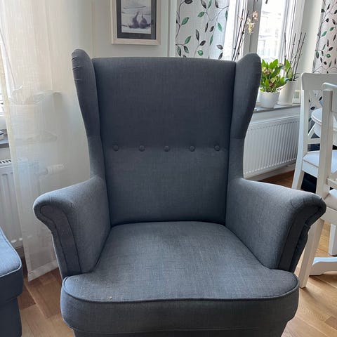 Säljer min fåtölj och fotpall av modellen Strandmon. Bakre benen har skadats lite efter en flytt och tyget i nackstödet är något nött, se bilder. Nypris 3 294 kr.