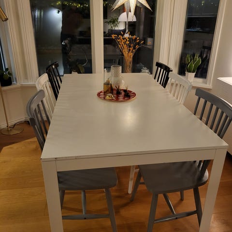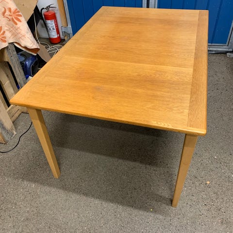 Massivt trä. Väldigt fint och otroligt praktiskt matbord med två extra iläggsskivor på 50cm vardera. Även när de extra skivorna används är benen längst ut vilket gör det elegant och enkelt att duka för många.