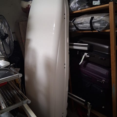 Knappt använd men råkades klämmas till när den skulle ut ur förrådet. Fortfarande brukbar, dock!