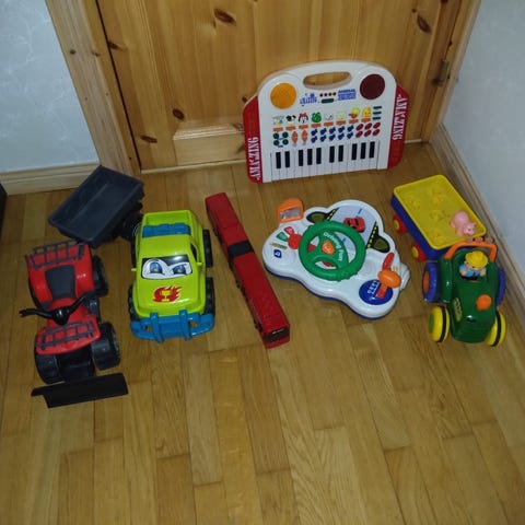Leksaks set bestående av traktorer,leksaks buss,leksaks pistol och en skotare.