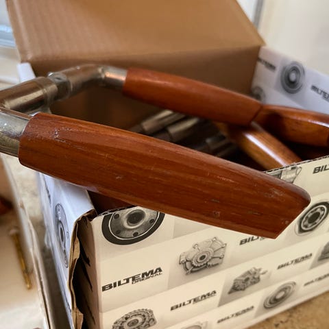 Gamla handtag / beslag med skruvar och plastbrickor / täckbrickor. 16 st + några extra plastbrickor.