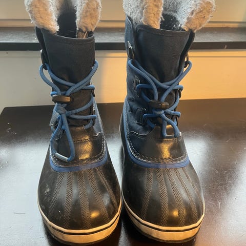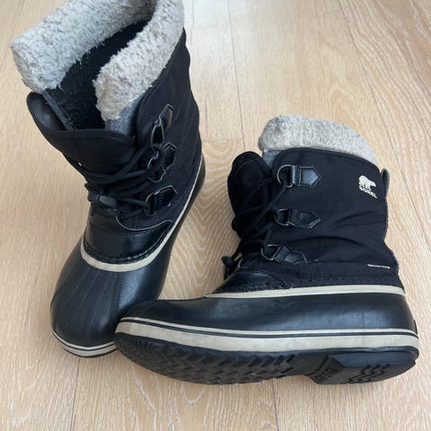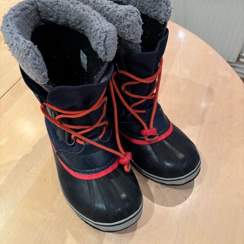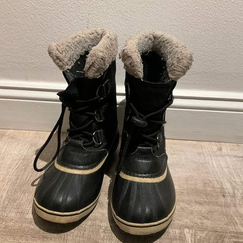 Sorel barnskor i storlek 38 för unisex. Skorna är svarta med snörning och har en fodrad insida för värme och komfort. Yttersulan är mönstrad för bättre grepp. Passar för barn och kan användas vid kallt väder. Passar även vuxna.