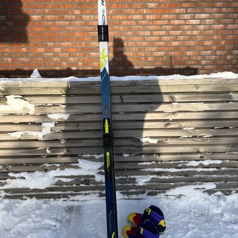Längdskidor med pjäxor till barn. Madhaus skidor, längd 140 cm. Pjäxor Fischer, storlek 34.