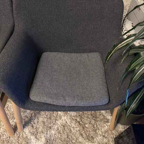 Formpressad fåtölj med ekben. Textilklädd sits. Obetydligt använd