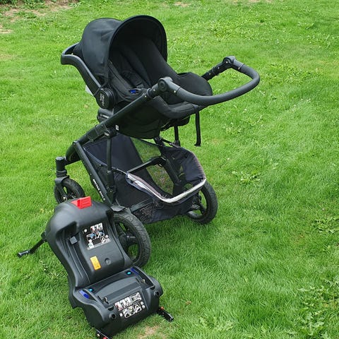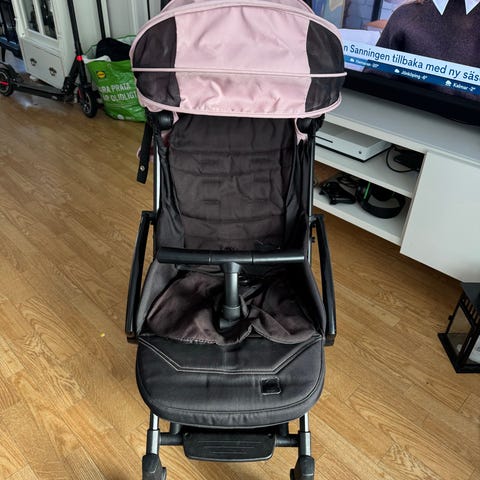 Carena Yxlan barnvagn med textil i färgen Seal Grey och svart chassi. Barnvagnen har svarta plastdetaljer och är utformad för barn.