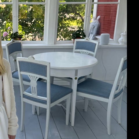 Stolarna är i äkta skinn och valnöt. Bordet är i valnöt.