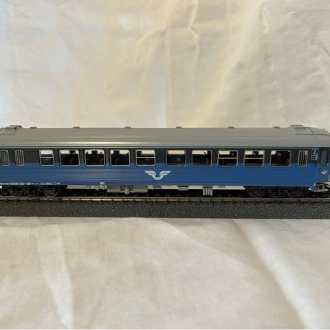 Passagerarvagn för modelljärnväg i trä med inbyggd belysning. Vagnen har detaljerade fönster och tak med små utsmyckningar. Den är avsedd för modelljärnvägsspår och är utrustad med kopplingar i båda ändar. Vagnen är lämplig för samlare och modelljärnvägsentusiaster.