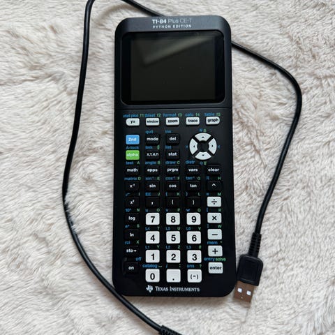 Texas Instruments TI-84 Plus är en grafräknare i svart färg. Den har en stor display och flera funktioner för matematiska och statistiska beräkningar. Enheten är utrustad med ett skyddande lock för att skydda knappsatsen och skärmen. Batterier som finns i medföljer.
