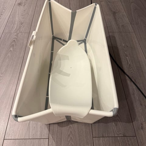 Stokke badbalja med bebis inlägg. Smidig ihopfällbar badbalja med värmeindikator som visar om vattnet är för varmt.