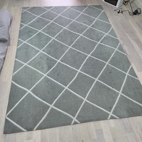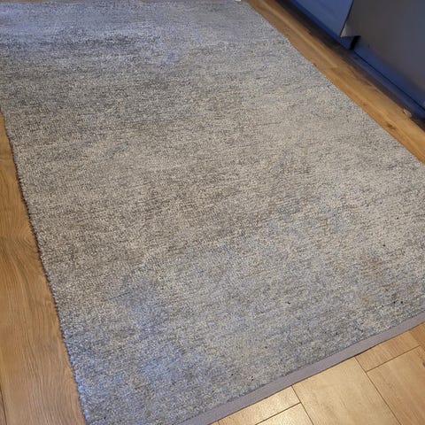Grå matta med vitt mönster. Lite ”långhårig ”. 195 cm lång och 135 cm bred.