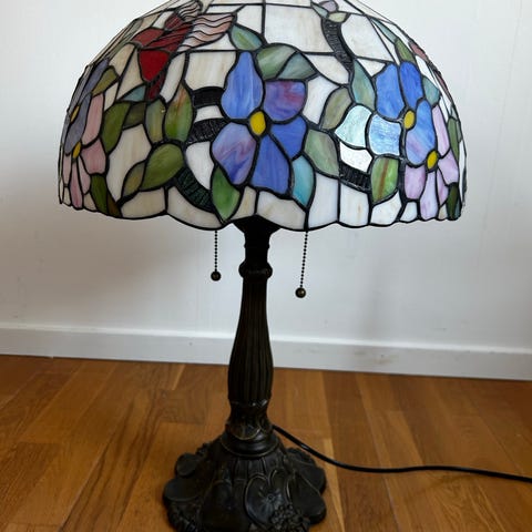 En charmig bordslampa med en vacker glasskärm i Tiffany stil, fot i metall i form av en trädstam.
