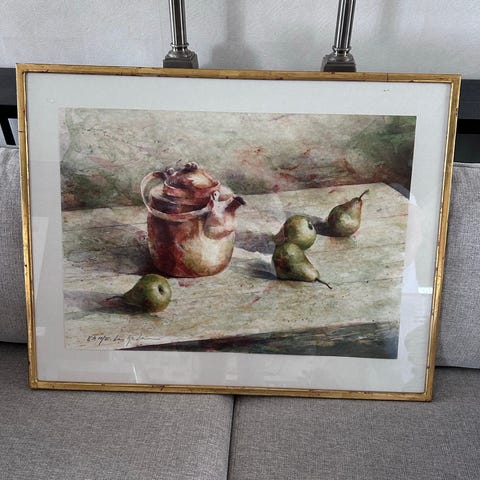 O. H. Källström oljemålning på duk limat på masonit föreställande ett stilleben med flaska, krus och frukt. Målningen är inramad i en dekorativ guldram. H 50 cm L 42 cm.