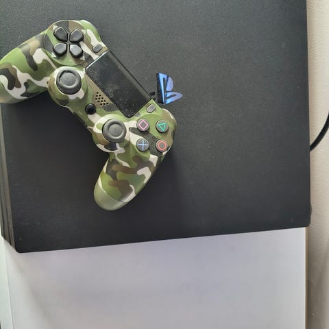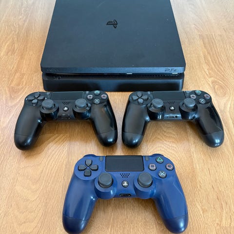 Sony Playstation 4 spelkonsol med två handkontroller i svart och beige. Prestandan är väldigt bra. Paketet inkluderar fem spel: Marvel Avengers, Injustice, Need for Speed, Cars och ett spel med titeln "Orfazm". Konsolen är svart och har de nödvändiga kablarna för anslutning.