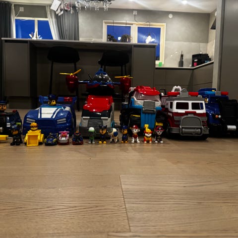 Paw Patrol lekfordon i form av en brandbil och en polisbil tillsammans med ett set magneter med karaktärer från Paw Patrol. En hänge.