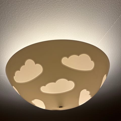 En lampa för barnrum i blå plast med vita moln. Den har en diameter på cirka 35 cm