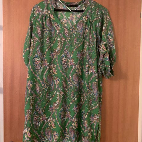Zara Vardagsklänning i storlek S, tillverkad i linne och i färgen grön. Klänningen är designad för kvinnor och har knappar framtill samt ett bälte i midjan. Materialet är luftigt och passar för vardagligt bruk.