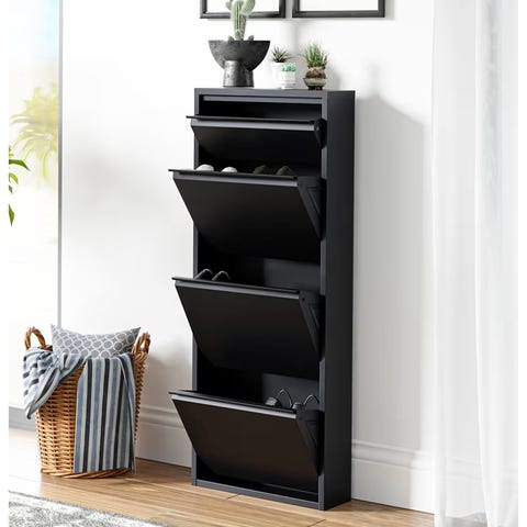 Svart skoskåp med tre lådor, höjd 117 cm, bredd 53 cm och djup 24 cm. Skoskåpet är tillverkat i trä och har metallhandtag. Passar för förvaring av skor i hall eller annan plats i hemmet.