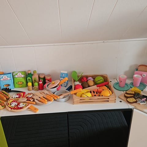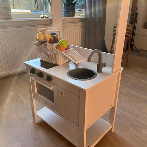 Leksakskök och vänder du på det kan du ha café eller vad nu fantasin kan tänka 😊 tillbehör ses på bilderna, te.x Kassaapparat, pizza x2 (tyg+trä), gryta och stekpanna i trä, varukorg, godis etc.