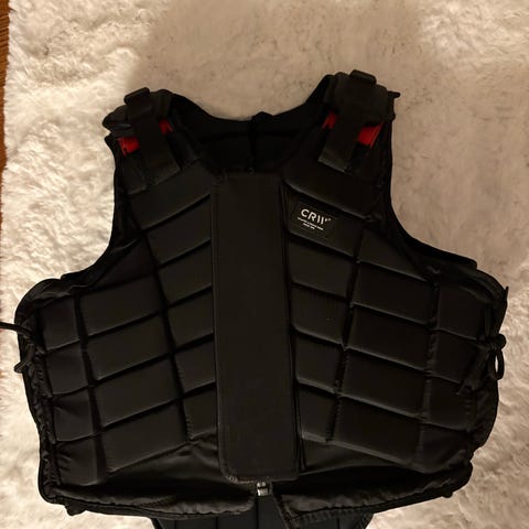 Skyddsväst med vadderade paneler och snörning för justering. Tillverkad i ett kombinerat material med mjuk insida och slitstark utsida. Används för kroppsskydd vid aktiviteter som kräver extra säkerhet och dämpning.