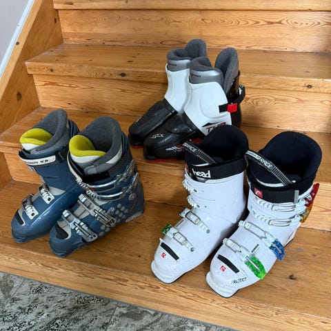 Skidpjäxor från Salomon, grå i storlek 24,0 och de vitsvarta i storlek 24,5, 250 kr per par