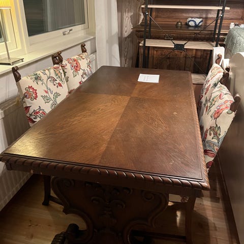 Snyggt ekbord 90 x 180 med två iläggsskivor 45 cm.