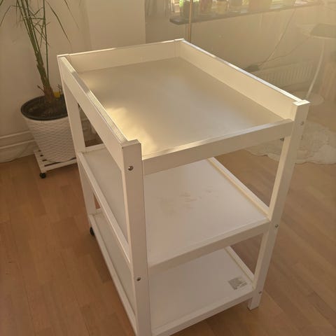 Praktiskt skötbord me tidlös design. Fyra låsbara hjul gör det lätt att flytta. En låda och två hyllor ger gott om plats för att förvara blöjor, tvättlappar, kläder och övrigt.