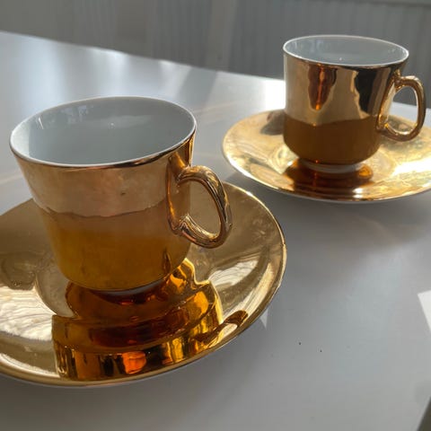Bavaria kaffekoppar med tillhörande fat i flera olika färger. Kopparna är av porslin och har en klassisk design. Passar för servering av kaffe/glögg el annan dryck. 9 kompletta samt fyra extra fat.