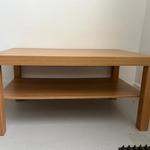 IKEA soffbord LACK i träfärg med en hylla under för förvaring. Soffbordet är något slitet i ena hörnet, men inga andra skador.