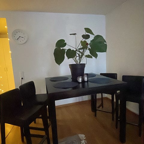 Matbord och stolar med avtagbara sittdynor från ikea. Mörkbrun.