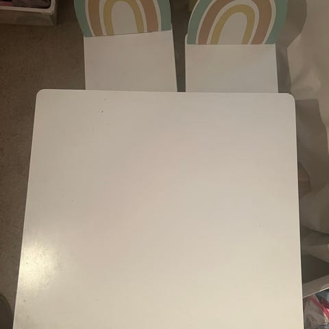 Jollyroom barnmöbelset bestående av ett bord, en bänk och två stolar. Möbelsetet är tillverkat i trä och har en vit färg. Passar för barn och kan användas för olika aktiviteter som lek och pyssel. Setet visar vissa tecken på användning, inklusive en "mutter". Se bild.