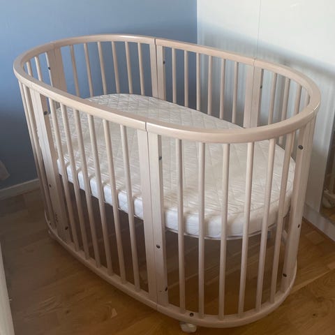Säljer en Stokke Sleepi spjälsäng i gott skick – en trygg, stilren och mycket omtyckt säng som växer med ditt barn från nyfödd upp till ca 5 år.