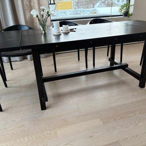 220 cm i ursprungsskick, sen finns två skivor a 50 cm så bordet kan bli 320 cm.