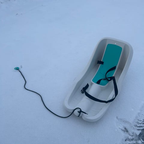 Barnpulka i vitt med grönt säte. Pulkan är tillverkad i plast och har säkerhetsrem för att hålla barnet på plats. Passar för vinterlek och transport av barn i snö. Från 1-3år